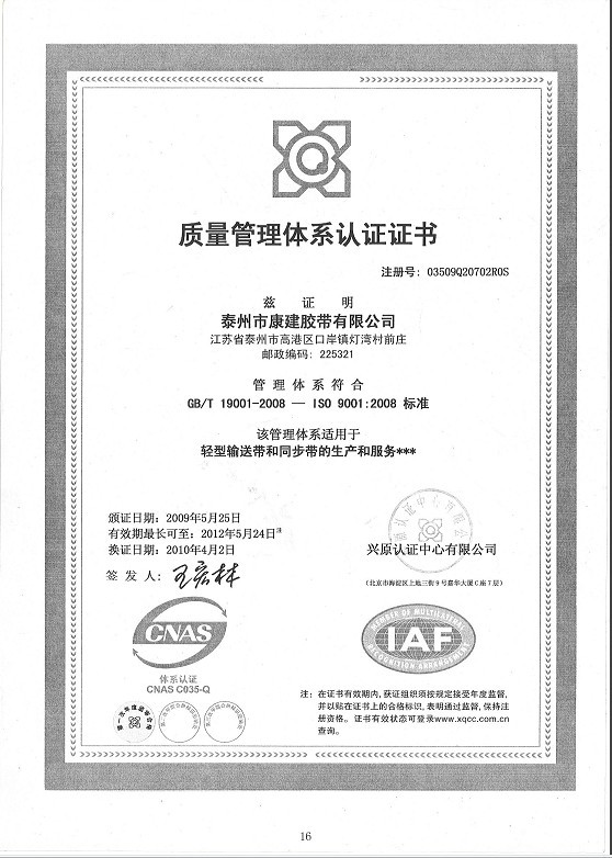泰州市康建膠帶有限公司經(jīng)過(guò)十多年的發(fā)展已經(jīng)成為一家從事輸送帶和傳動(dòng)帶類(lèi)及相關(guān)設(shè)備生產(chǎn)和銷(xiāo)售的公司。位于中國(guó)經(jīng)濟(jì)發(fā)達(dá)的長(zhǎng)三角經(jīng)濟(jì)圈江蘇省泰州市高港區(qū),交通發(fā)達(dá)。我司以“合格的產(chǎn)品,滿(mǎn)意的服務(wù)”為宗旨,發(fā)揚(yáng)團(tuán)結(jié)、開(kāi)拓、拼搏爭(zhēng)先的創(chuàng)業(yè)精神,“康建”在全國(guó)行業(yè)樹(shù)立了良好的企業(yè)形象?!翱到ā碑a(chǎn)品已通過(guò)ISO9001國(guó)際質(zhì)量體系認(rèn)證,從原料﹑工藝等方面進(jìn)行了嚴(yán)格的控制,從而確保了產(chǎn)品質(zhì)量的穩(wěn)定可靠,成為各......